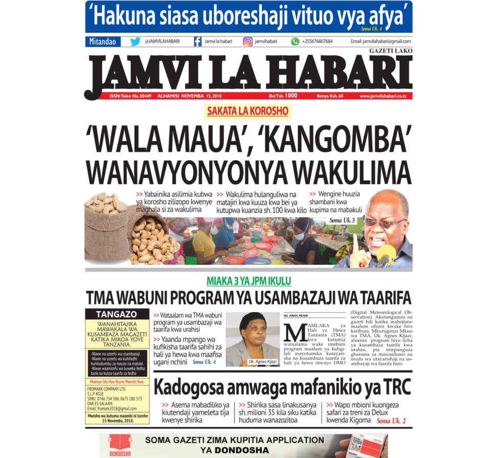 Soma magazeti ya leo Alhamis tarehe 15/11/2018