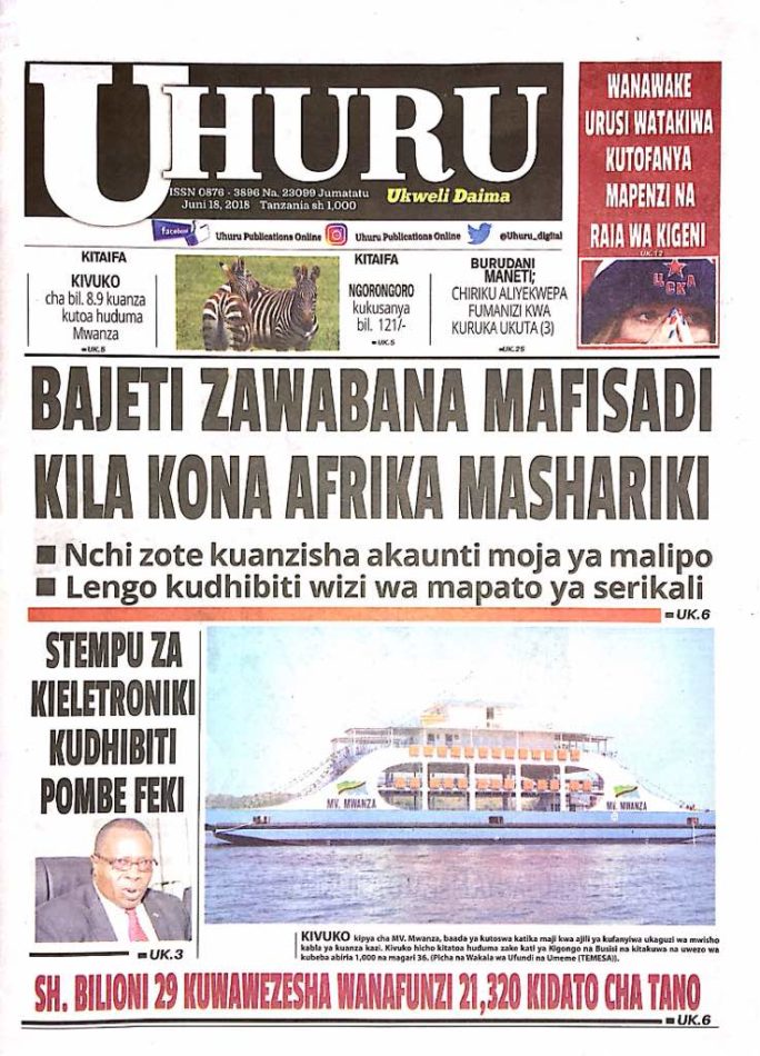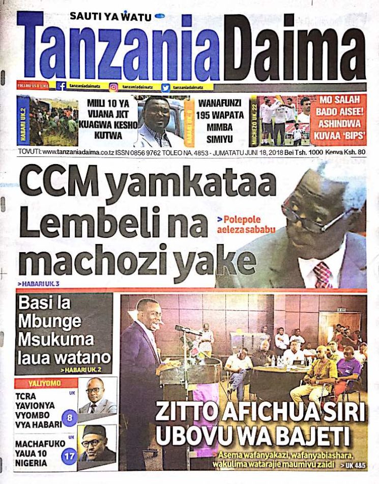 Soma magazeti ya leo Jumatatu tarehe 18/06/2018