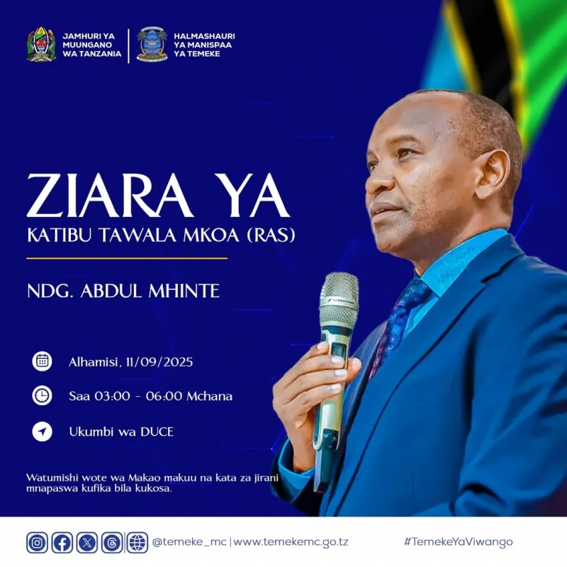 Kesho Alhamisi ya Tarehe 11/09/2025 Saa 3:00 kamili Asubuhi, Katibu Tawala Mkoa wa Dar es Salaam Ndg. Abdul Mhinte ataongea na Watumishi waliopo Makao Makuu ya Manispaa ya Temeke na Kata za Jirani katika Ukumbi wa DUCE.